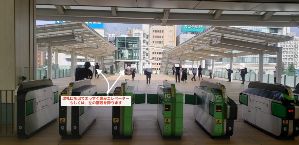 - 改札口を出てまっすぐ進み、エレベーターもしくは左の階段を下ります