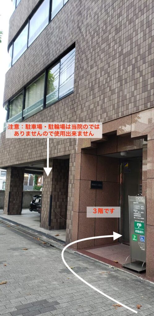 - 当院のビルに到着です。駐車場・駐輪場は当院のではありませんので駐車できません。