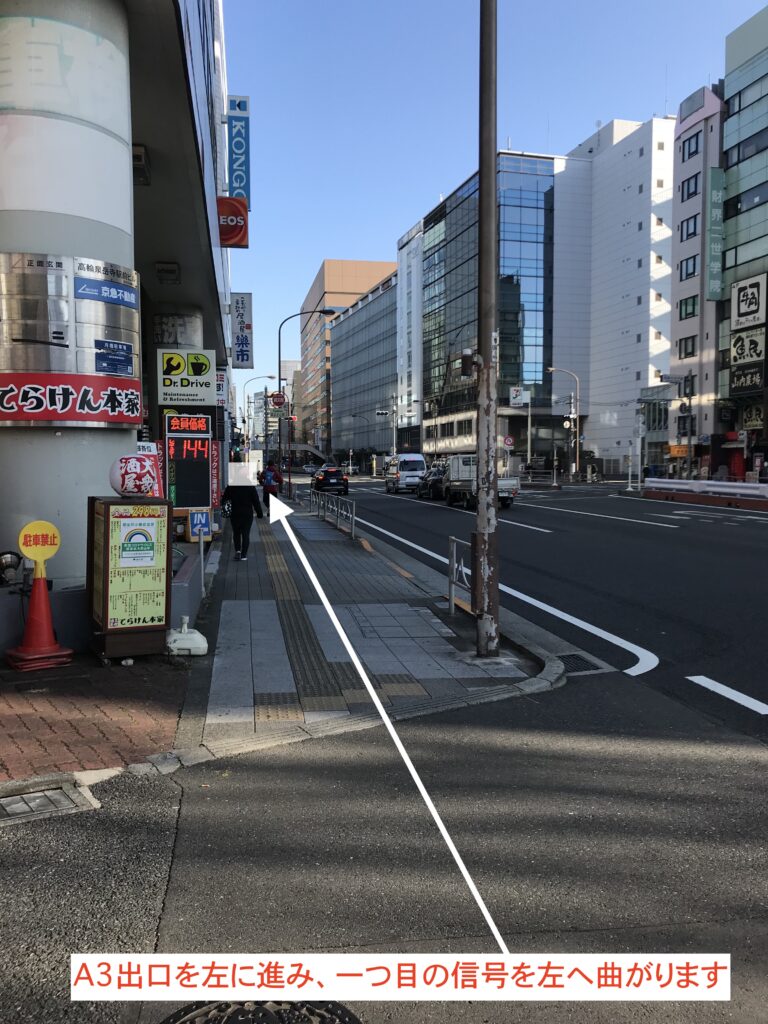 - 1,A3出口を左に進み、一つ目の信号を左へ曲がります