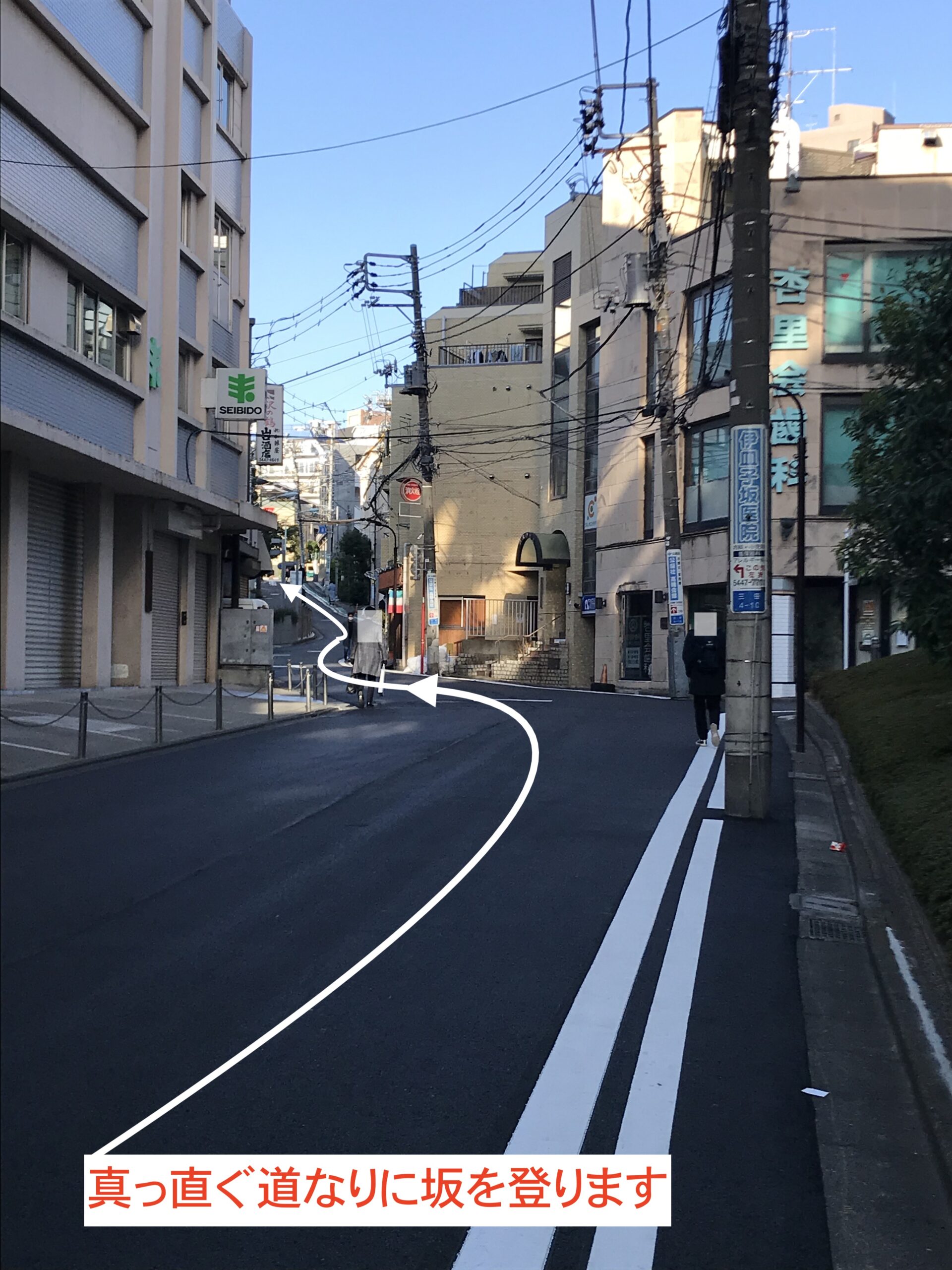 - 横断歩道を渡り、坂を上がります