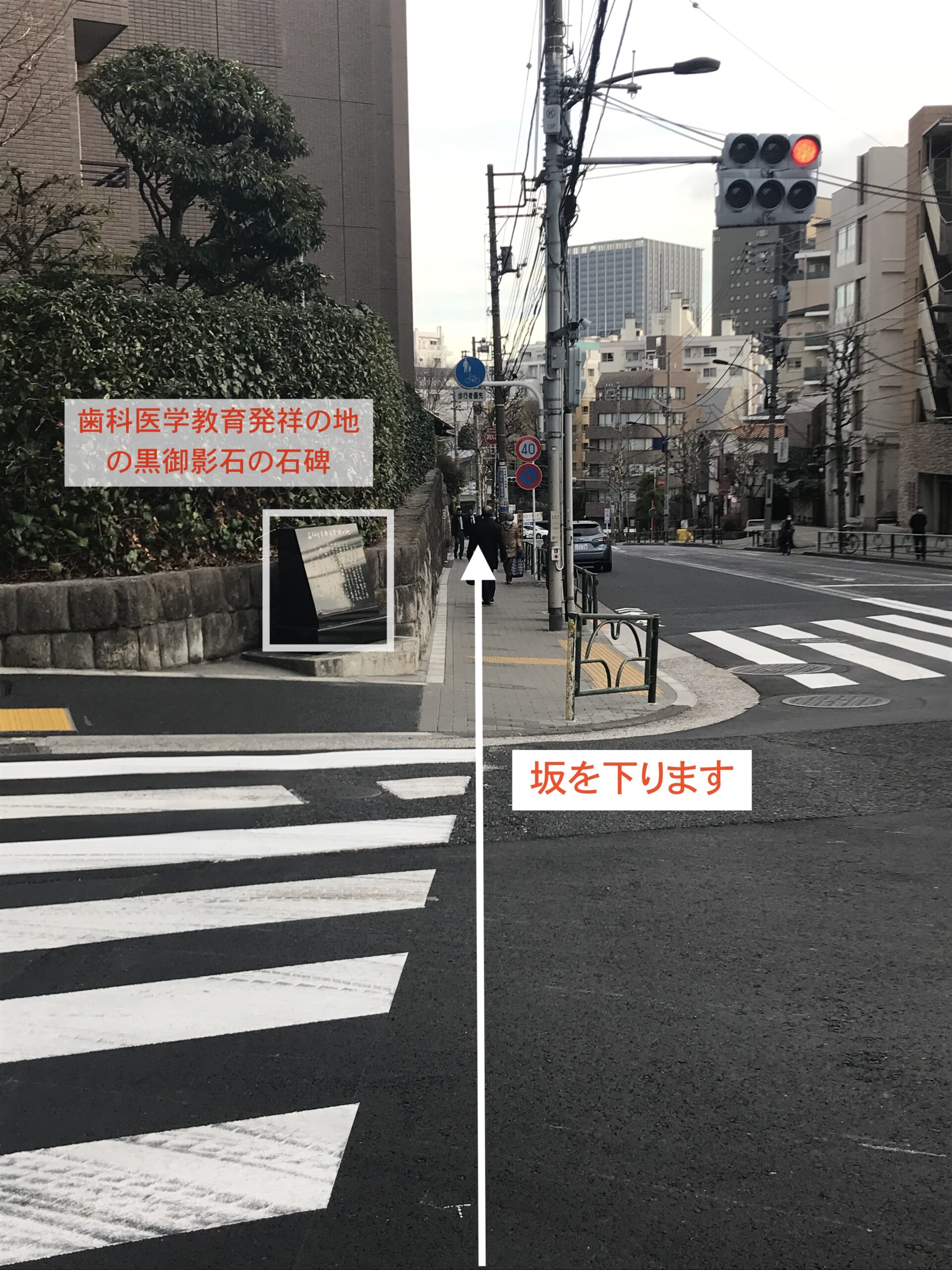 - 7,歯科医学教育発祥の地の石碑を目印に、坂を下ります