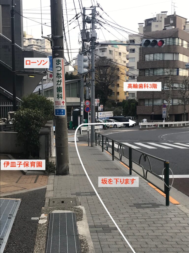 - 8,左側にローソンが見えたら、右側に高輪歯科が見えます